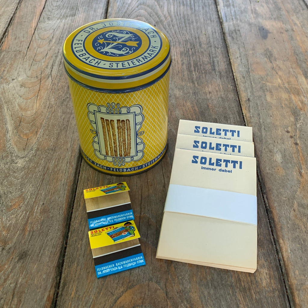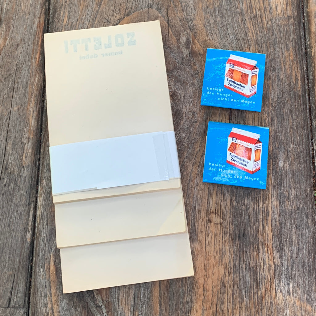 - 2 Werbezündhölzer "Soletti", 5,5 x 5,5 cm