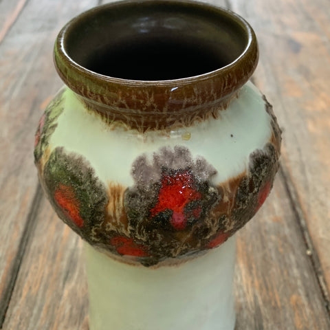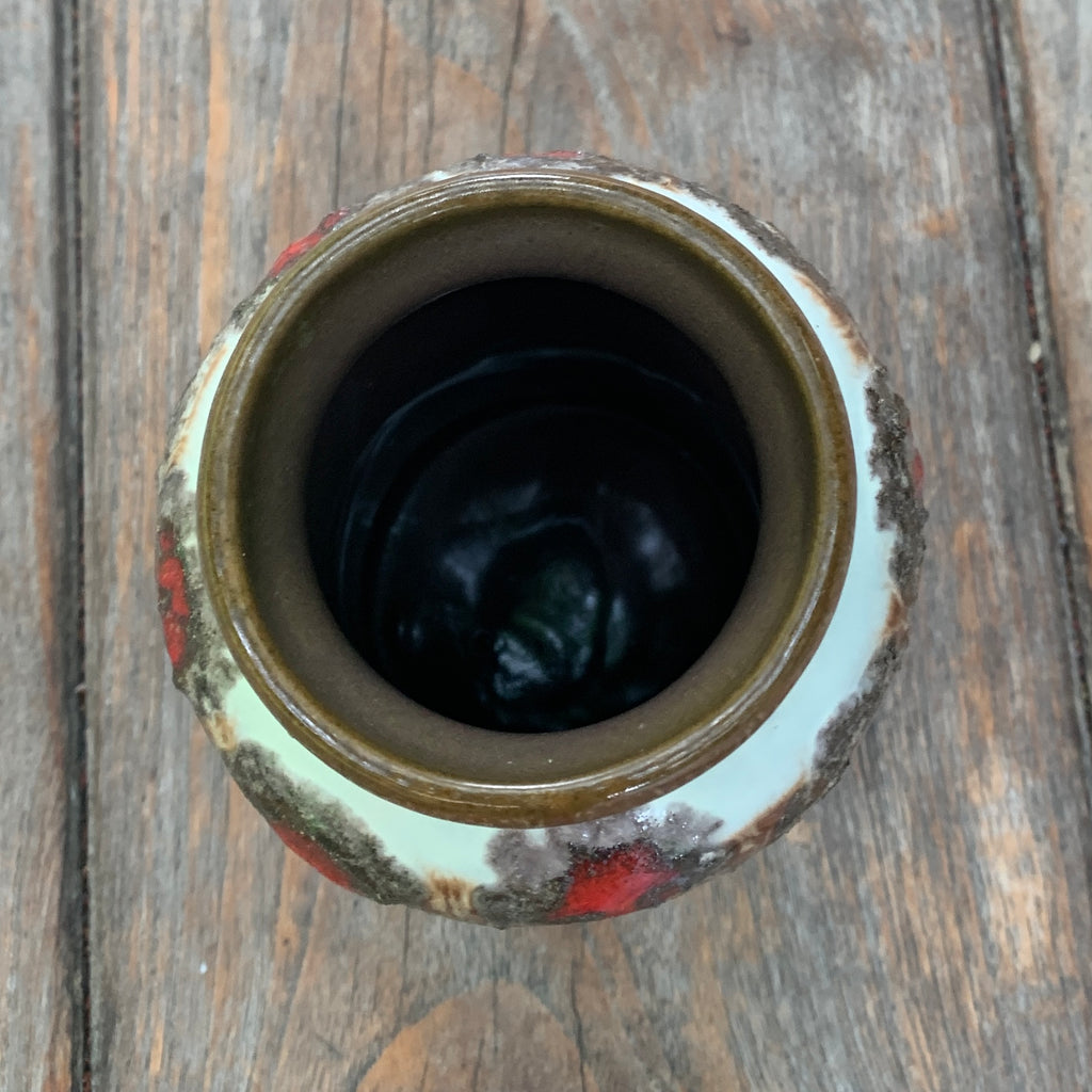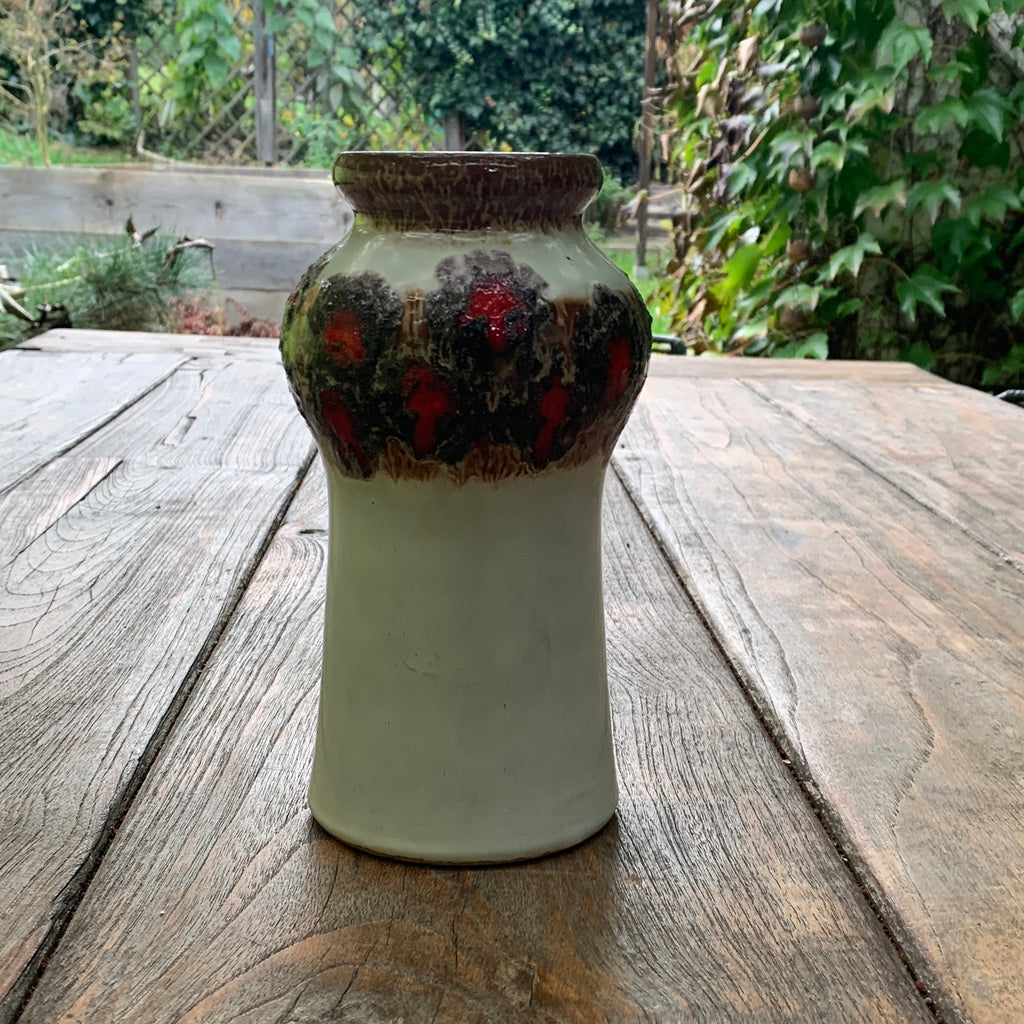 Diese Strehla Keramik Vase aus den 1960er/70er-Jahren besticht durch ihre charakteristische Fat-Lava-Glasur im oberen Bereich, die in intensiven Rot- und Brauntönen gehalten ist. Der untere Teil präsentiert sich in einem dezenten, cremefarbenen Ton, der einen harmonischen Kontrast zur lebhaften Glasur bildet. Das markante Design und die typische Materialbeschaffenheit machen diese Vase zu einem herausragenden Beispiel für die keramische Gestaltung jener Epoche. Ideal für Sammler und Liebhaber authentischer Vintage-Keramik.
