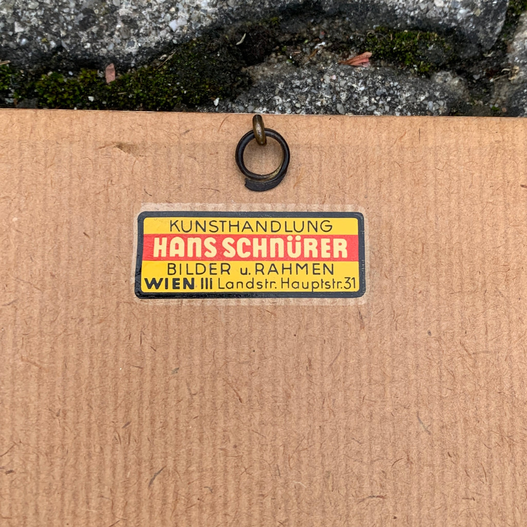 Rückseite mit Klebetikett der Verkaufsstelle: Kunsthandlung Hans Schnürer, Wien III