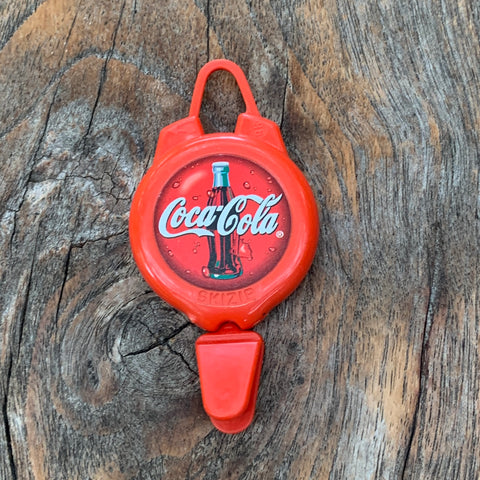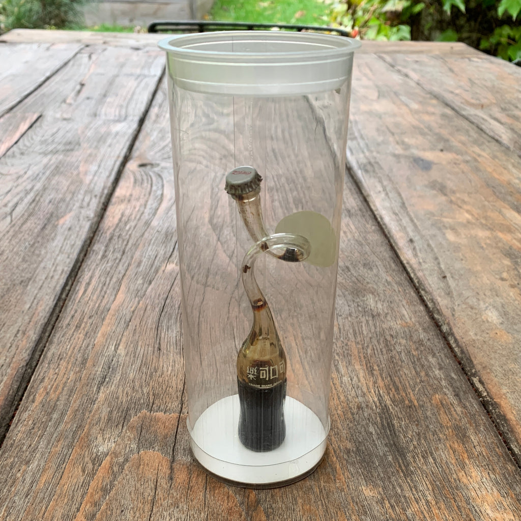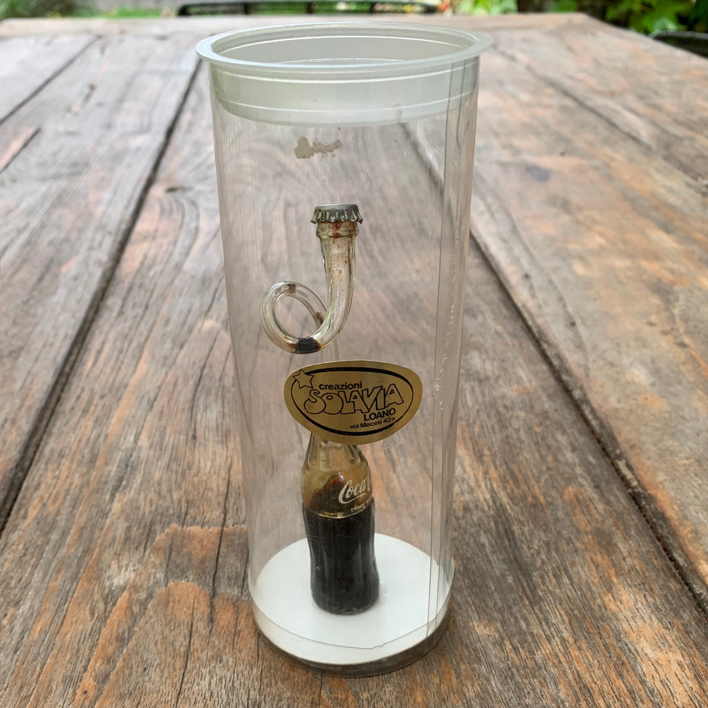 Mini Coca Cola Flasche (Glas) mit gedrehtem Hals: Ø 2,0 cm, Höhe 12,0 cm, Inhalt -  gefärbtes Wasser, Schutzhülle aus Kunststoff von Creazioni Solavia, Loano, Italy