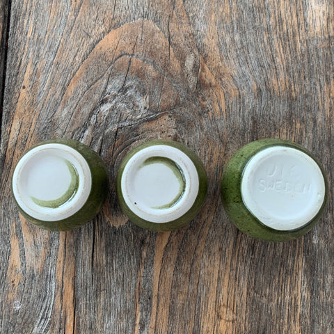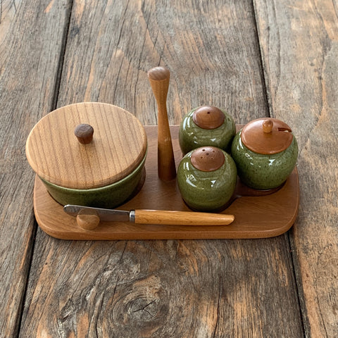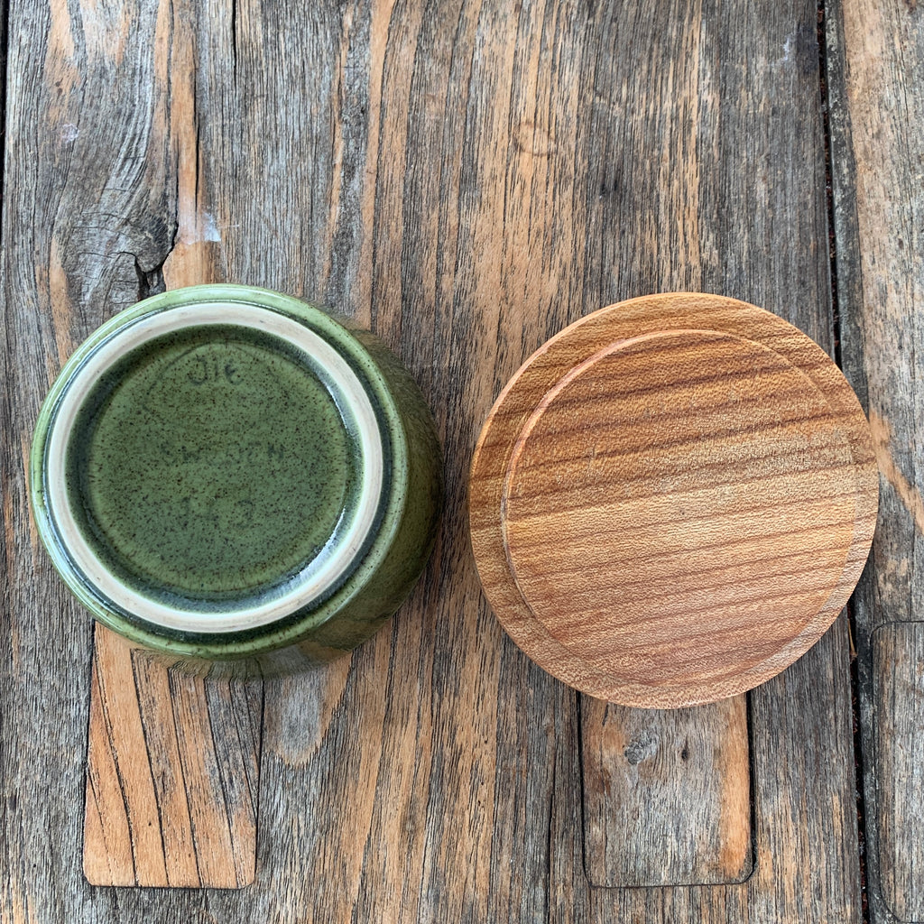 - Senfdose aus Keramik mit Holzdeckel und Kunststofflöffel, Ø 6,5 cm, Höhe 6,5 cm, gemarkt - Jie Sweden, Löffel gemarkt - Japan