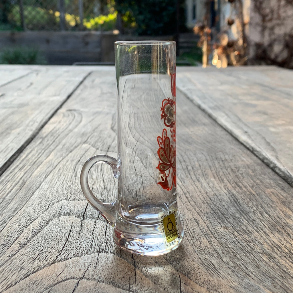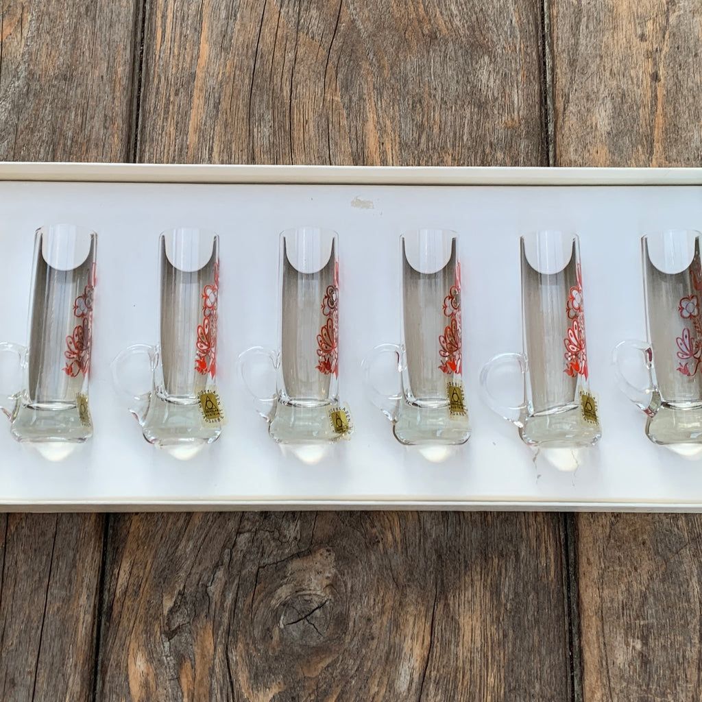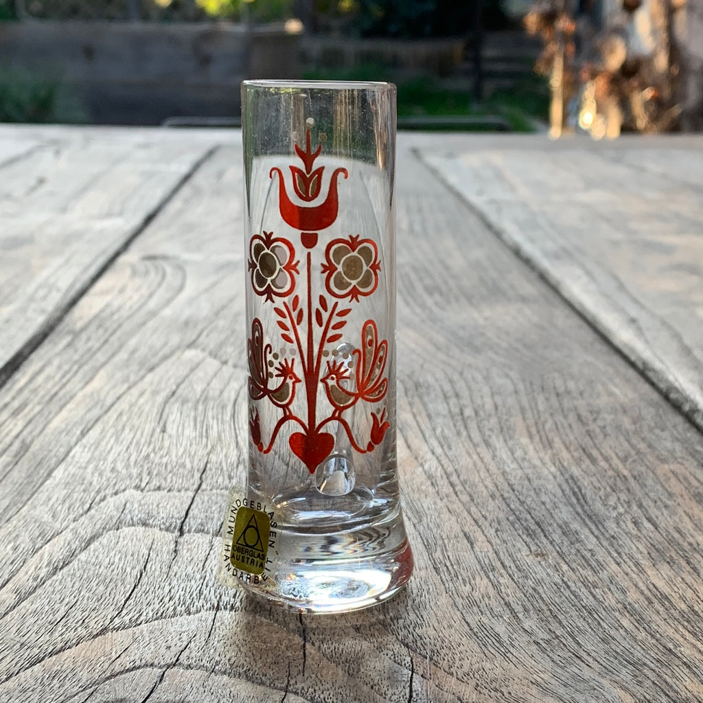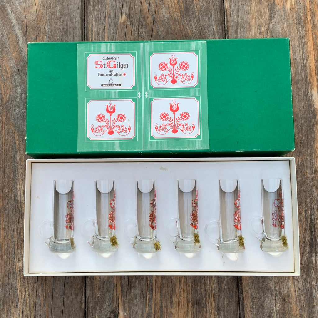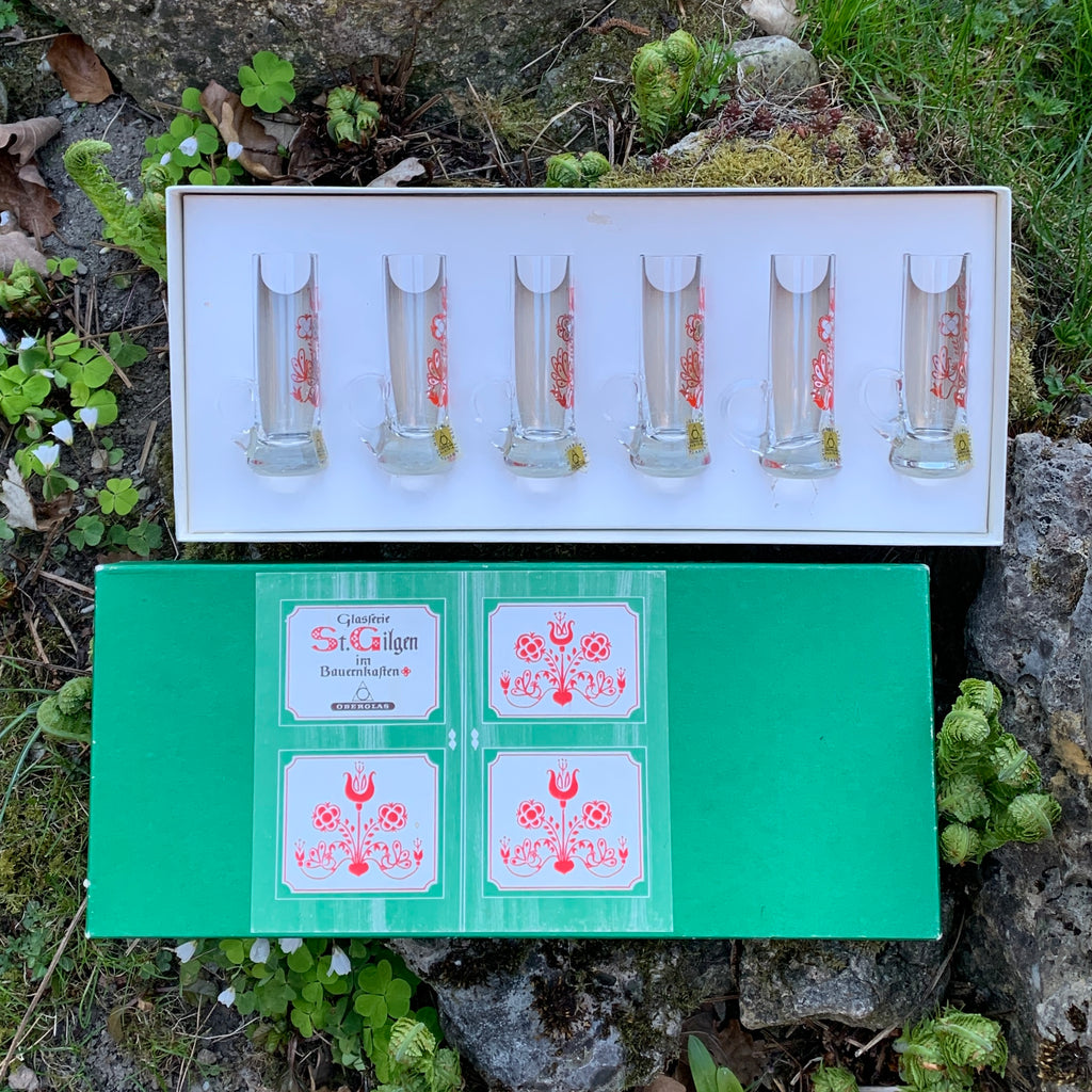 6 Stück mundgeblasene Schnapsgläser aus der St. Gilgen Glasserie im Bauernkasten